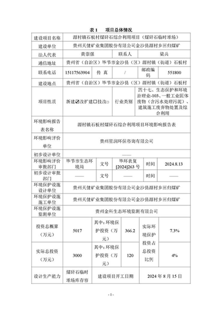 建設(shè)單位:貴州天健礦業(yè)集團(tuán)股份有限公司金沙縣源村鄉(xiāng)回歸煤礦