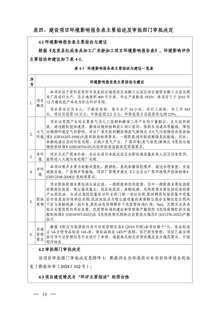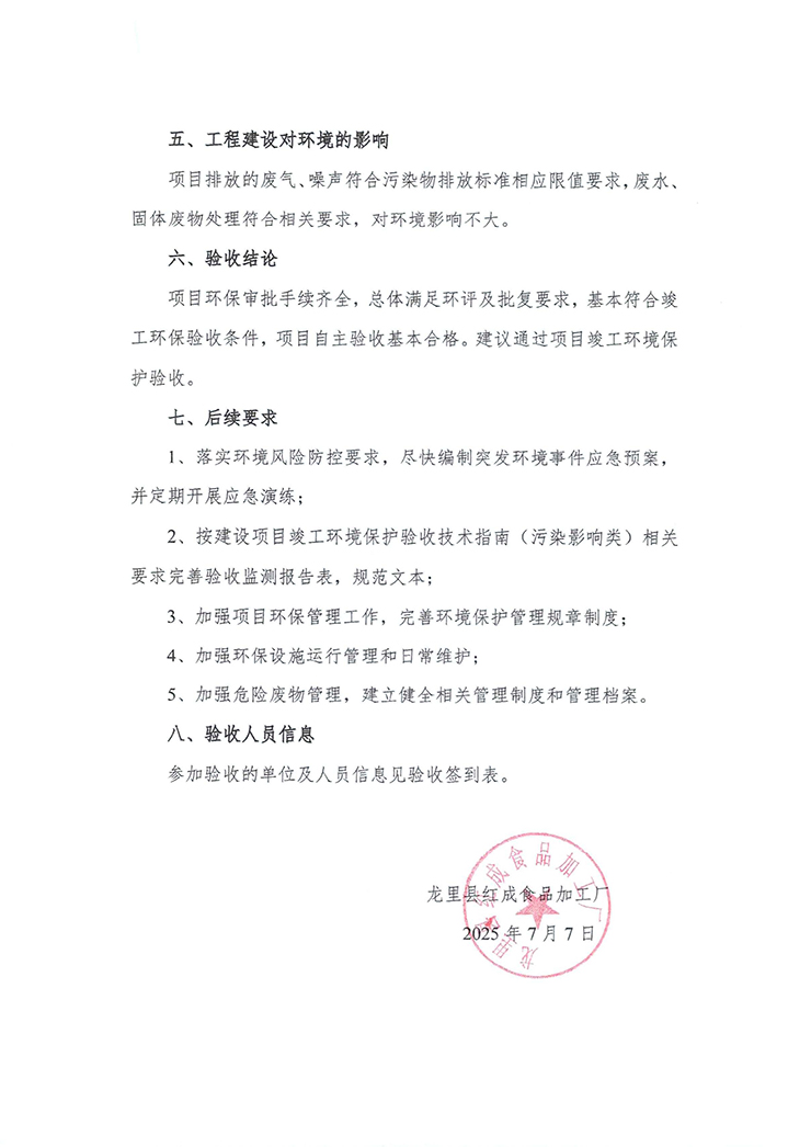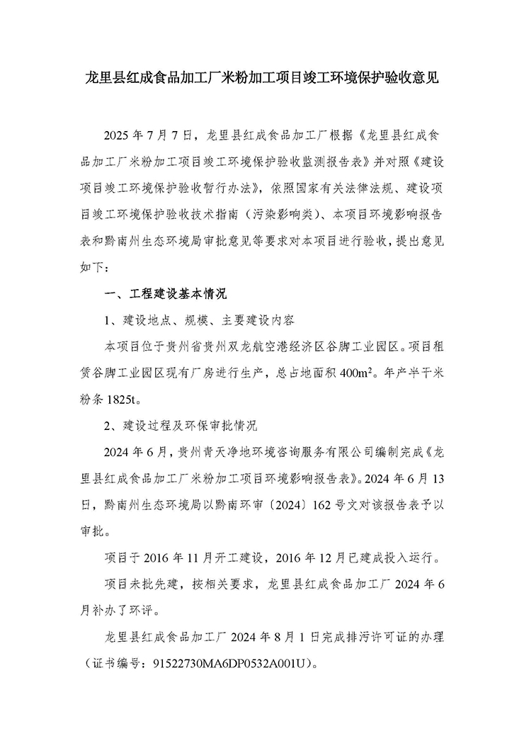 根據《國務院關于修改<建設項目竣工環境保護管理條例>的決定》(國務院令第682號),以及環保部《關于發布<建設項目竣工環境保護保護驗收暫行辦法>的公告》(國環規環評[2017]4號),現將《龍里縣紅成食品加工廠米粉加工項目竣工環境保護竣工環境保護驗收監測報告》公示如下: 項目名稱:龍里縣紅成食品加工廠米粉加工項目 建設單位:龍里縣紅成食品加工廠 公示內容:驗收調查報告,驗收意見 公示時間:2025年7月8日-2025年8月4日 公示期間:對上述公示內容如有異議,請以書面形式反饋,個人須署真實姓名,單位須加蓋公章 聯系人:唐紅成 聯系電話:13984899483 驗收報告公開載體:網絡公示。