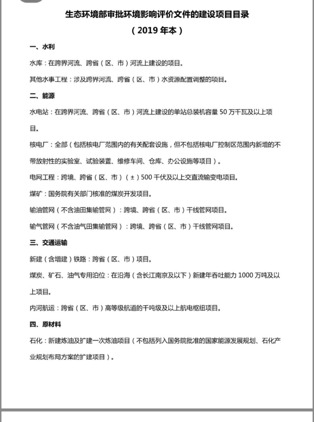 關于發布《生態環境部審批環境影響評價文件的建設項目目錄(2019年本)》的公告