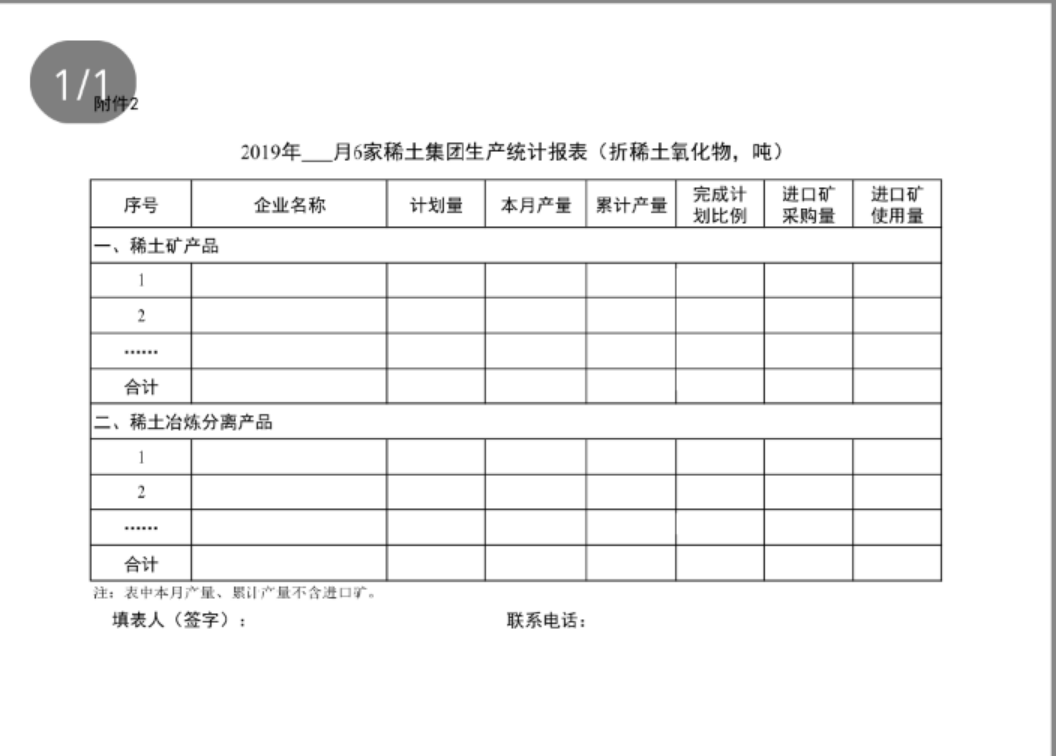 請按照統計報表(見附件2)要求,于每月10日(節假日順延)前上報上個月數據和生產情況,同時上報稀土產品追溯系統填報數據。