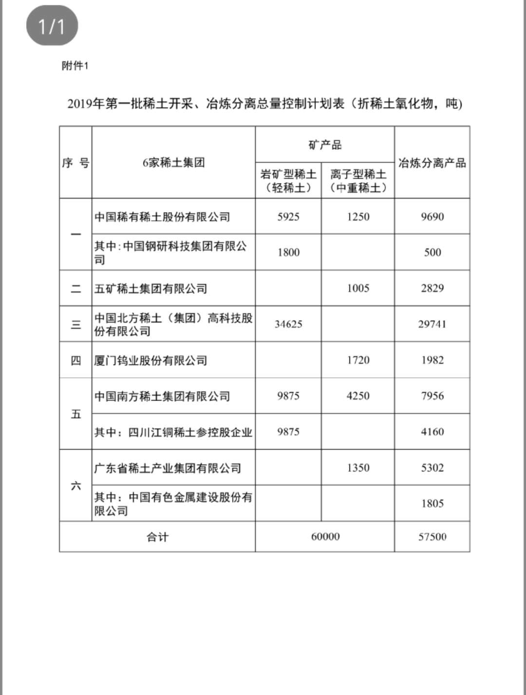 一、稀土是國家嚴格實行開采、冶煉分離總量控制管理的產品,任何單位和個人不得無計劃和超計劃生產。2019年度第一批稀土開采、冶煉分離總量控制計劃按2018年度指標的50%下達,分別為60000噸、57500噸,第二批計劃將綜合考慮市場需求和各集團的執行情況,于2019年6月底前下達。
