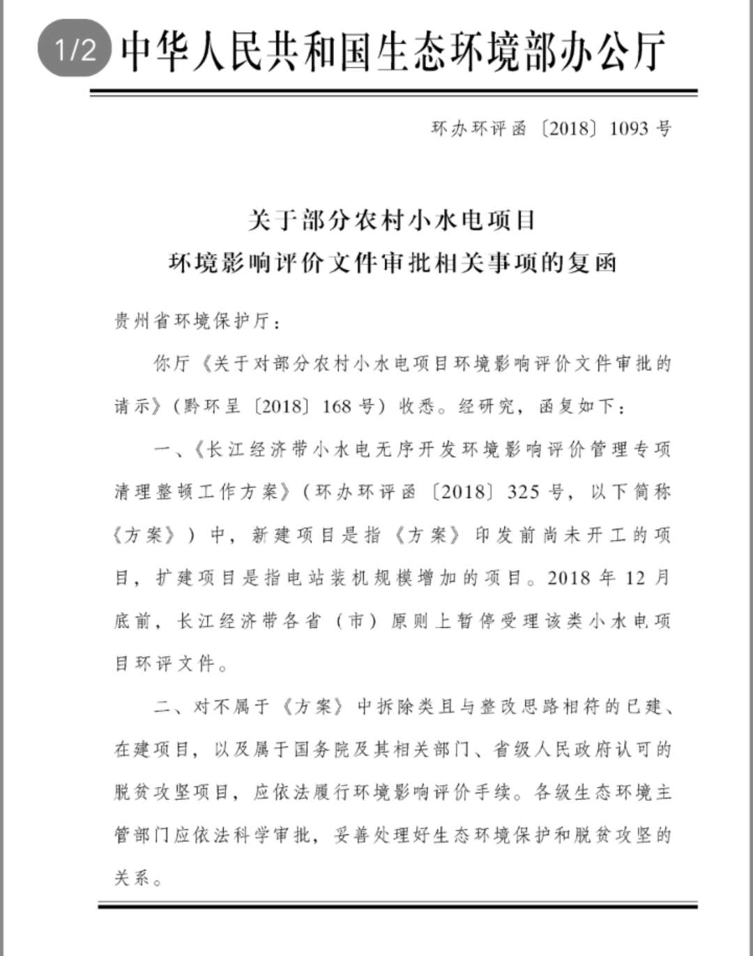 你廳《關于對部分農村小水電項目環境影響評價文件審批的請示》(黔環呈【2018】168號)收悉。經研究,函復如下: